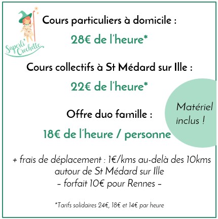Saperli’Crochette propose également des cartes cadeaux disponibles ici. Des cartes d’abonnement 7, 10 et 15 heures de cours de crochet sont également proposées pour bénéficier de tarifs dégressifs. Les cartes cadeaux et les cartes d’abonnement sont non nominatives et cessibles ;-)!!
